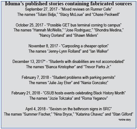 Dating back to last semester, Iduma’s stories which were published featured 20 names which are not registered in the CSU Bakersfield student information system.